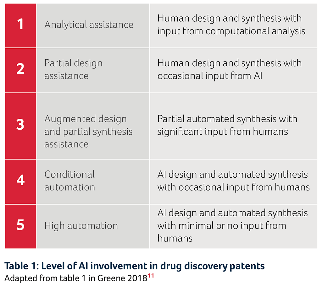 Biology was among the first areas of application for AI, and it continues to be an important topic (see Oliveira7 , Goh8, Shah9(2019) and Fuji (2017)10). A recent article on drug discovery proposes five levels of AI involvement, ranging from analytical assistance to entirely autonomous activity without human input (Table 1)