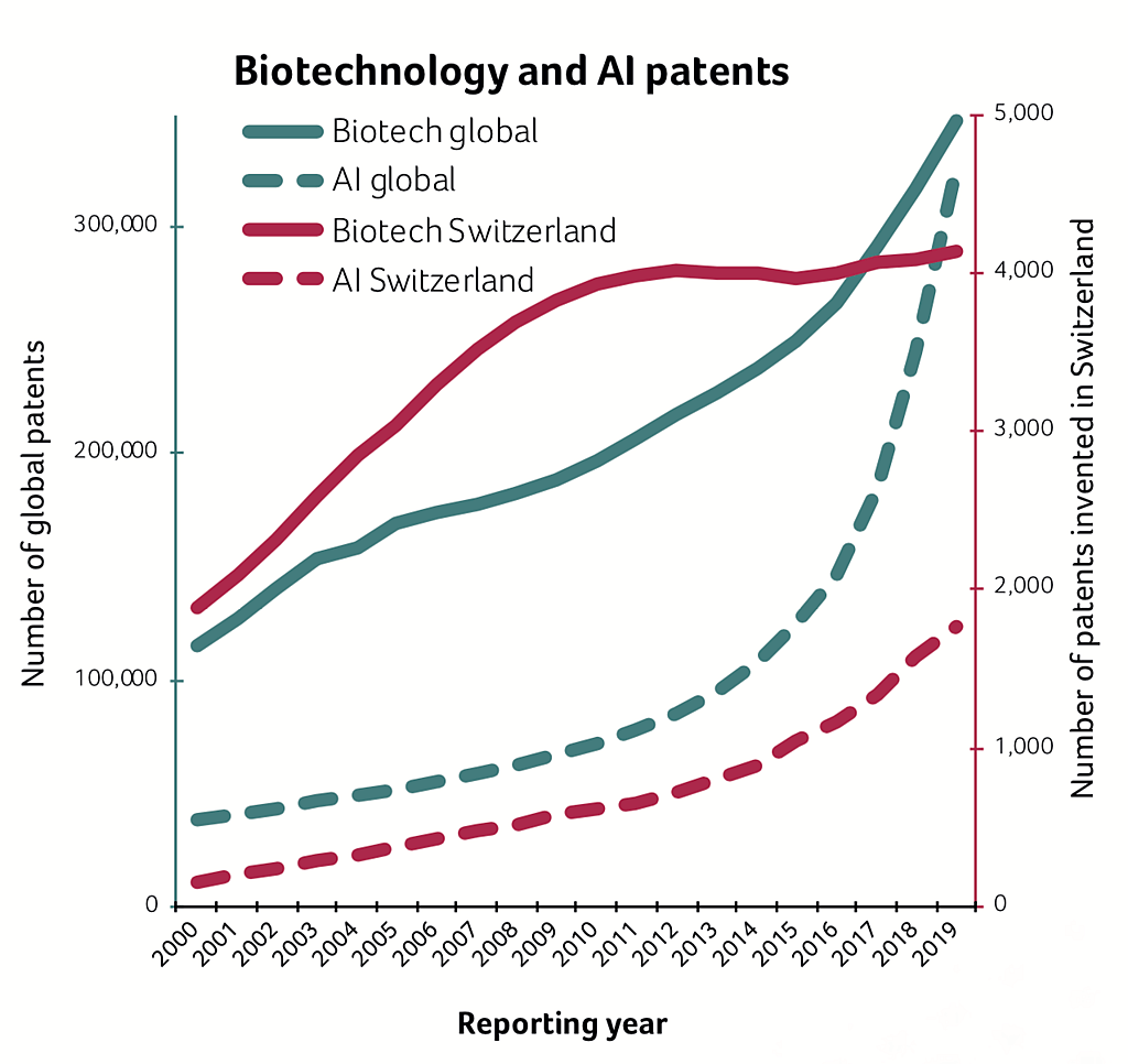 Over the past 20 years, both global and Swiss-invented AI patents in biotechnology show similar growth curves. In contrast, the larger sets - biotechnology and AI - reveal very distinct dynamics for the global and the Swiss portfolios (Figure 1).