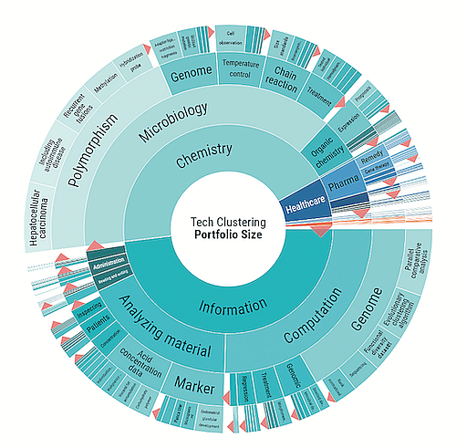 Figure 3: Technology Clustering of the intersection between AI and biotechnology patents (sunburst chart generated by AI-based semantic analysis)