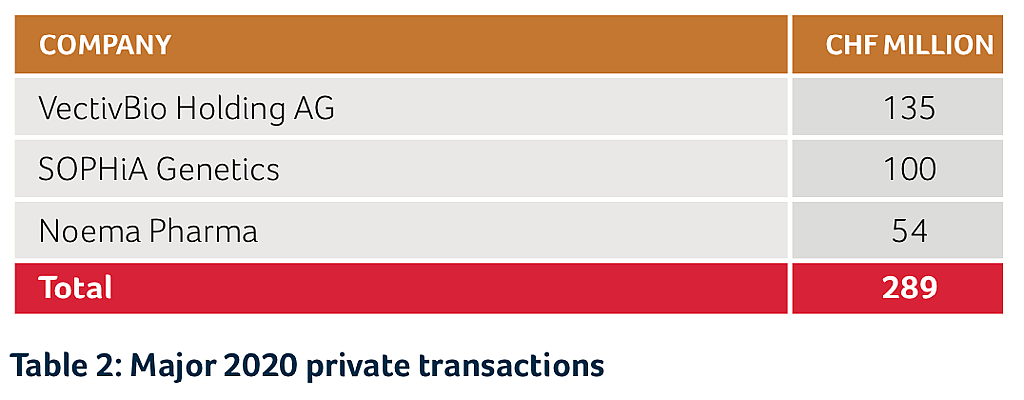 The biggest portion of the private capital was raised by VectivBio Holding AG in a combination of equity and debt financing totaling CHF 135M. SOPHiA Genetics was also able to raise CHF 100M and the newly founded company Noema Pharma got an initial capital injection from the founding VCs of CHF 54M.