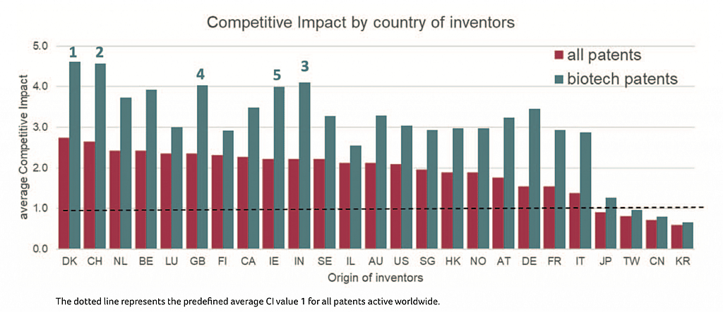 Denmark and Switzerland rank first, for both biotech and all patents