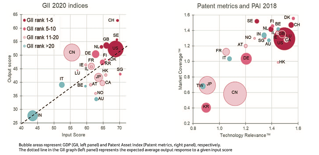 Switzerland and China stand out as the countries significantly exceeding their predicted GII output score (left panel). The top five GII 2020 countries (left panel) also locate in the sweet spot of the Patent Metrics (right panel).