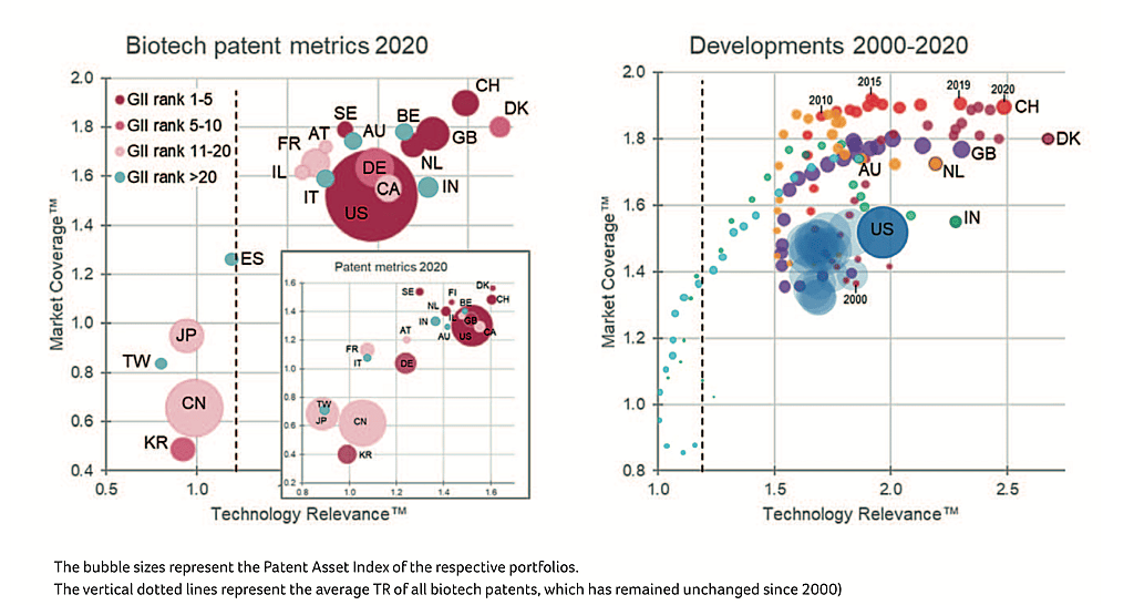 Switzerland’s top ranking in the Global Innovation Index (GII) over the last ten years results from many different aspects of fostering and implementing innovation. Patents represent only one of many quantifiable parameters of the GII, but the GII ranking and the patent metrics show a remarkable overlap: 15 countries rank among the top 20 in both patent metrics and GII. The overall patent landscape is similar to the 40 times smaller biotech patent landscape. The latter reveals an ongoing race between the leading countries of origin towards higher quality. Denmark and Switzerland are in the lead, closely followed by other European countries and emerging origins of high quality biotech inventions with lower rankings in the GII 2020, such as India or Australia. Switzerland excels in both high patenting activity evident from the GII and excellent patent quality, based on the patent metrics, particularly so in the biotech sector.