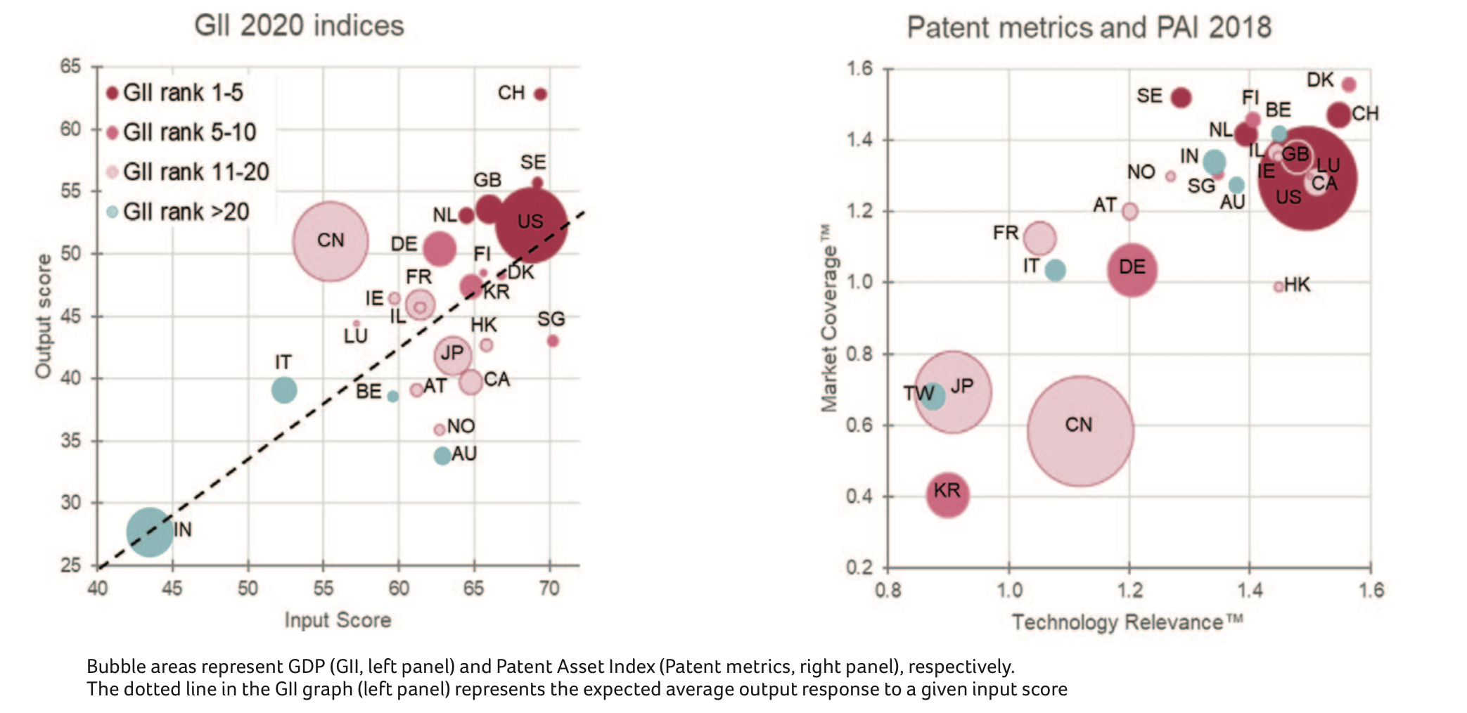 The GII output score (Figure 2, left panel) comprises 27 parameters, including intellectual property rights. While the GII mostly relies on quantitative patent data - i.e. number of national and international applications - the Patent Asset Index (PAI) combines patent quantity and quality, represented by the bubble sizes (Figure 2, right panel). The comparison reveals that 15 of the top 20 GII countries also belong to the top 20 patent inventor countries based on their PAI (Figure 2, right panel). In addition, the top five countries according to GII – Switzerland (CH), Sweden (SE), United States of America (US), United Kingdom (GB), and The Netherlands (NL) - all cluster in the top right quadrant, the high quality sector of the patent landscape.