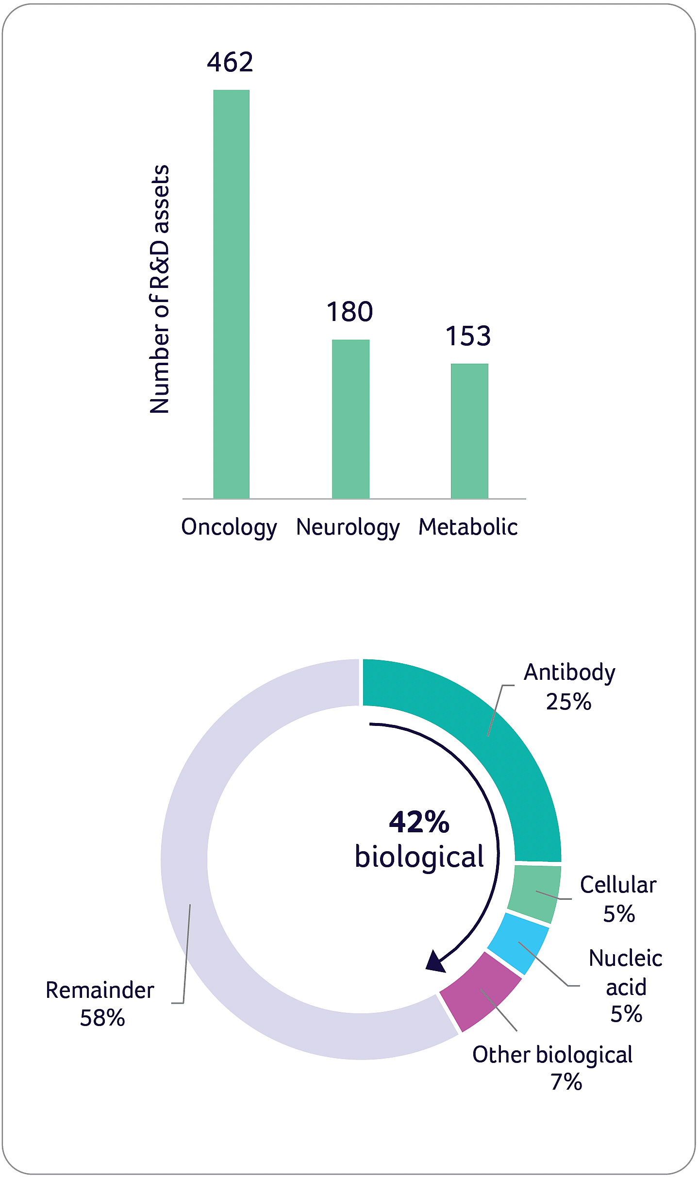 Within the pipeline, there is a keen focus on areas of particular unmet need, market opportunity, and novel science. The three major therapeutic areas under investigation are oncology, neurology, and metabolic, all of which are major drivers of industry growth. These are particularly well aligned with advances in multi-omics technologies, digital biomarkers, and the transformational effect of GLP-1 agonists.