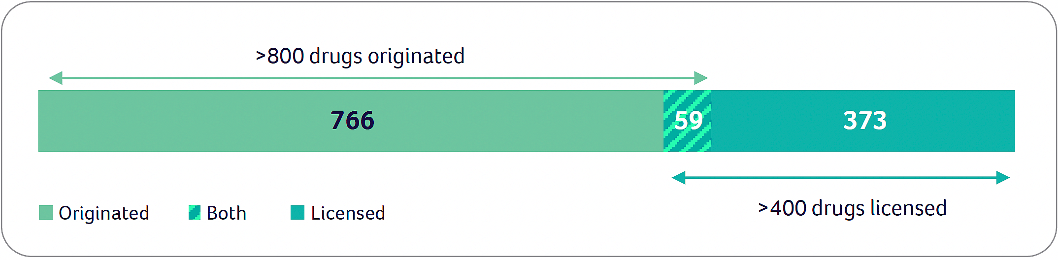 The fruits of this investment can be seen in the R&D pipeline of domestic biopharmas. Swiss companies currently have a collective pipeline of around 1’200 assets, spanning preclinical development through to lifecycle management for approved drugs.⁴ This collective footprint is among the largest in Europe, and importantly two thirds of these drugs are Swiss discoveries. Another third have been licensed from international sources, harnessing the infrastructure, funding, and expertise within Switzerland to further progress towards patients.