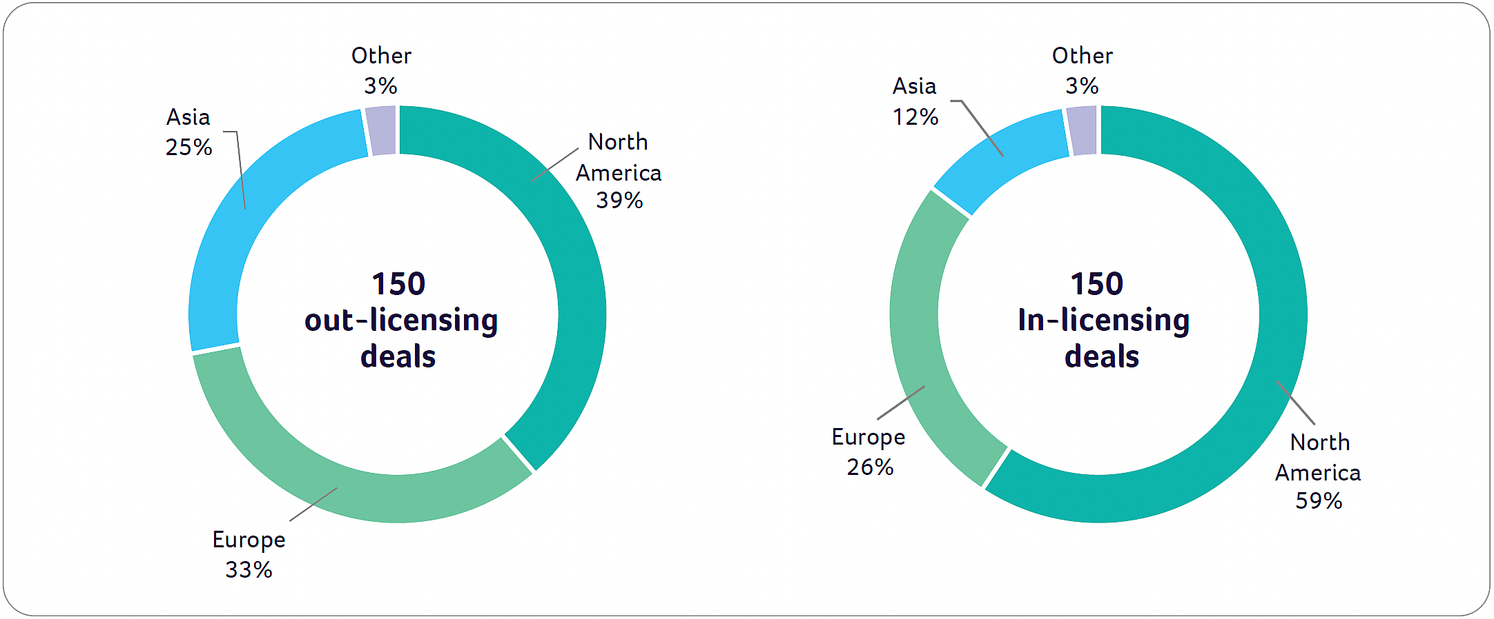 The relationship between CRISPR and Vertex is very typical. Many of the 800 pipeline assets originated by Swiss companies are either partnered, or will become available for licensing, in order to achieve an international reach. Since 2020, Swiss biotechs have completed 150 out-licensing or R&D alliance deals, featuring partners from across North America (39%), Europe (33%), and Asia (25%).⁵ The distribution is relatively even, indicating the readiness of Swiss firms to partner and export innovation across all borders.