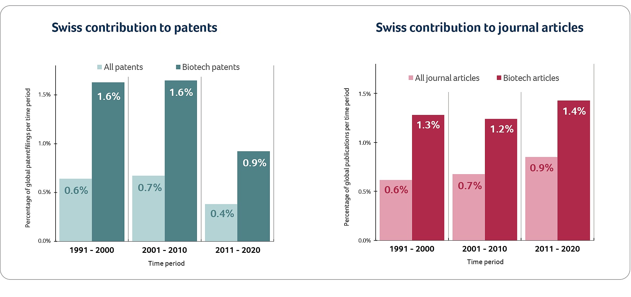 From 2011 to 2020, 13% of the 43 million journal articles published worldwide related to biotechnology. This proportion is around 20% for articles originating from North America, Japan, China, and many European countries including Switzerland, with only subtle differences between these countries and regions.