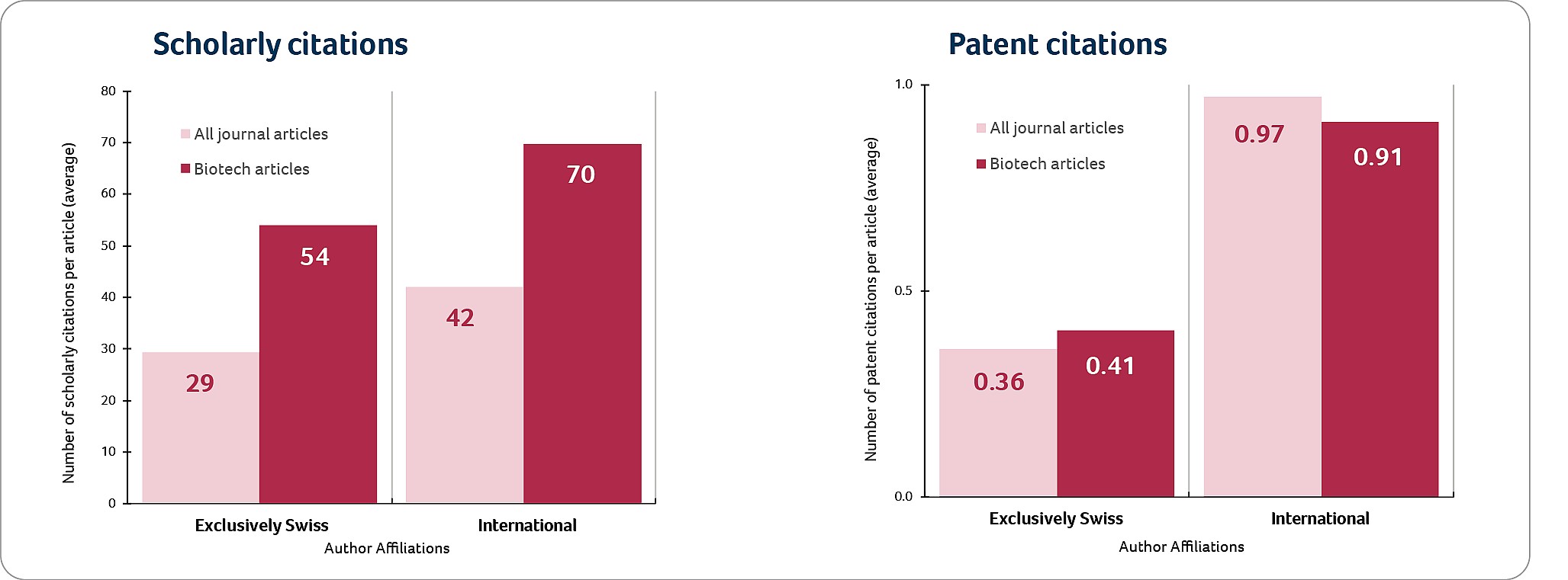 Journal articles with international authorship receive consistently more citations than those with exclusively Swiss authorship. This applies to both scholarly and patent citations, and to the biotechnology subset as well as to all papers.