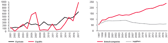 Companies and suppliers in the health biotech sector have shown consistent development over the last 20 years. Today this is one of the strongest segments of biotech activity in Switzerland. This growth has occurred despite sometimes challenging access to private investment or venture capital and very volatile public investment from IPOs (initial public offerings) and stock exchanges.