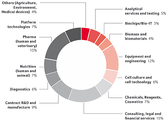 Over the time some companies discontinued operations, others were removed from the biotech statistics as they moved their headquarters outside of Switzerland or were reclassified as pharma due to mergers or acquisitions. Apart from health biotech, featured in the Swiss Biotech Report over the years, it is difficult to quantify Switzerland’s industry in other biotech sectors such as industrial biotech or agricultural biotech. Having said that, if we analyze the data from the SBA directories since 2007 we see very little change. The chart on page 7 shows distribution of activities of the listed Swiss biotech companies (multiple entries possible).