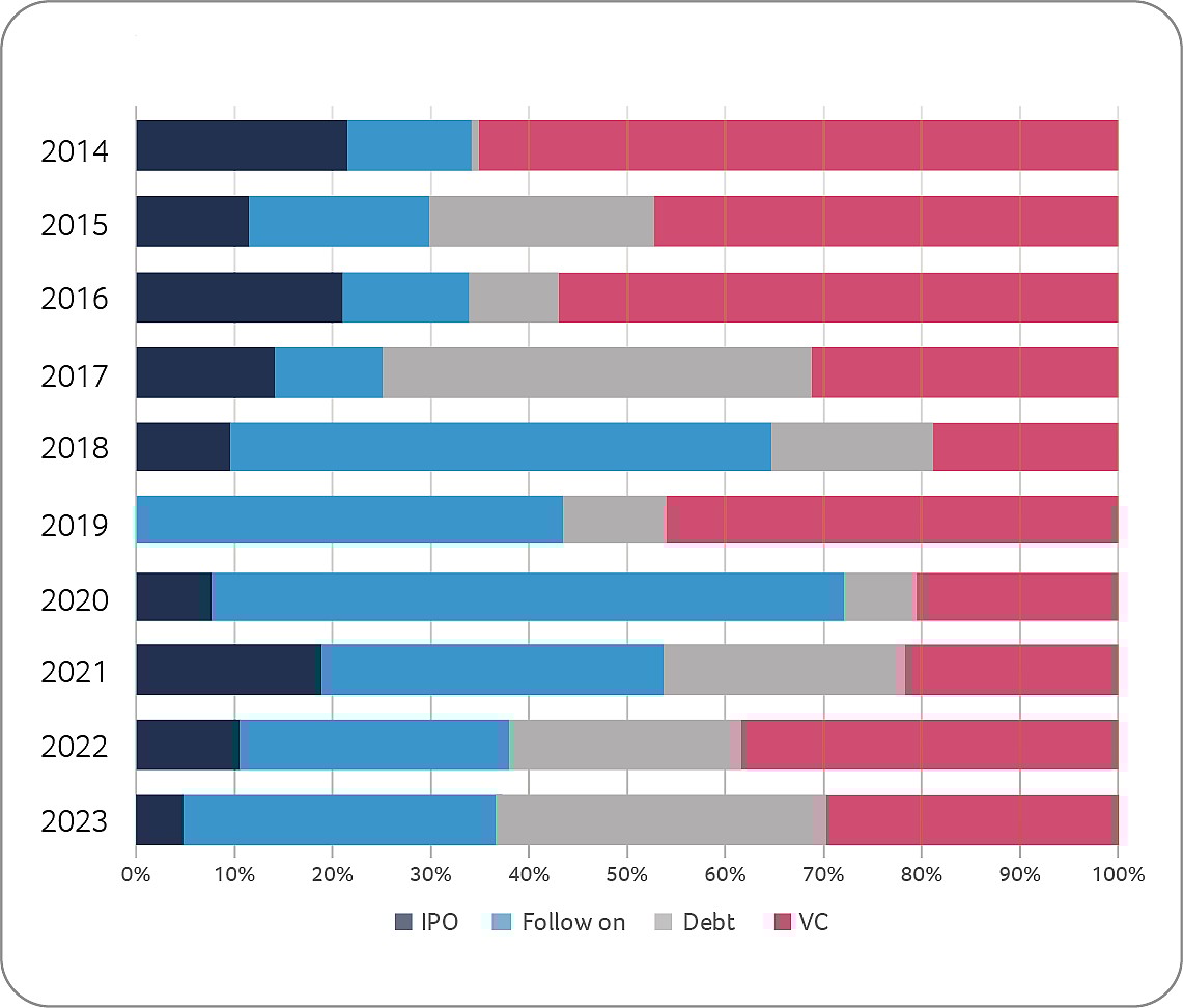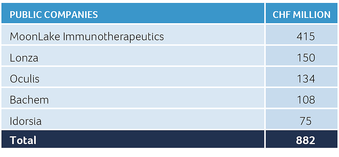 Further, MoonLake Immunotherapeutics, one of the two Swiss biotech companies that went public in 2022, due to some positive clinical results in 2023, was able to gain additional funds from investors through a follow-on transaction as well as from a market-share program (totaling approximately CHF 415 million).
