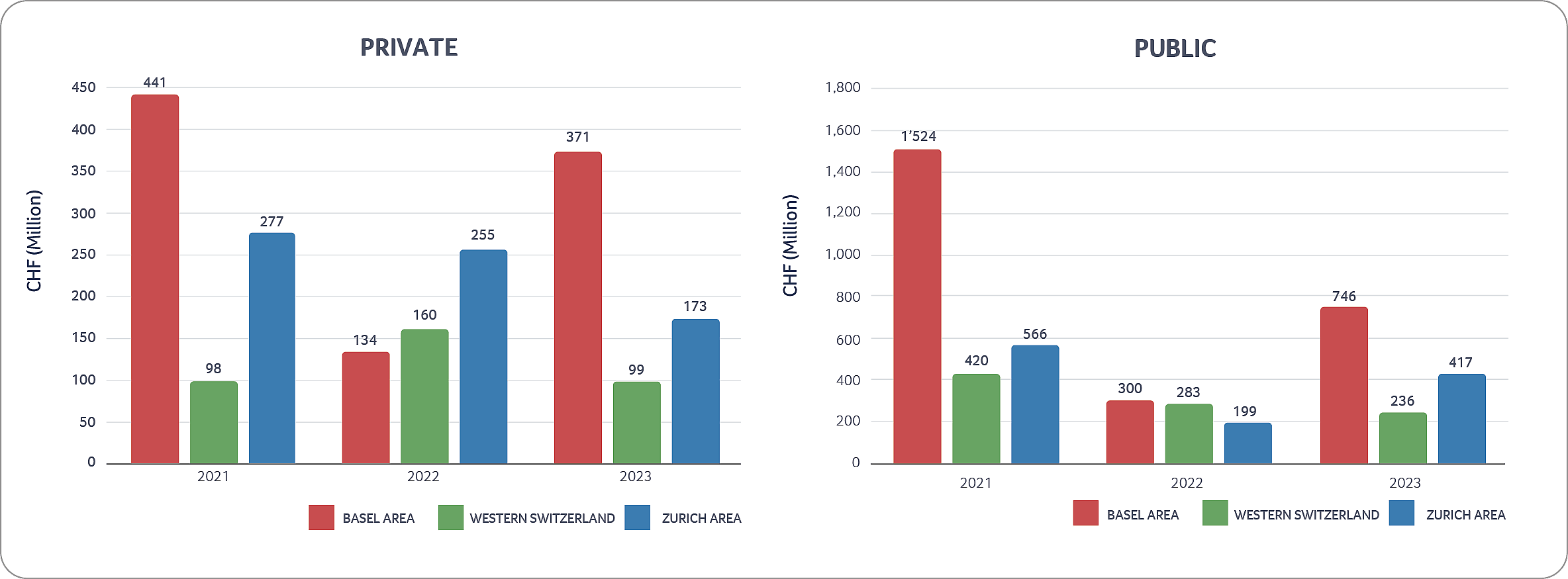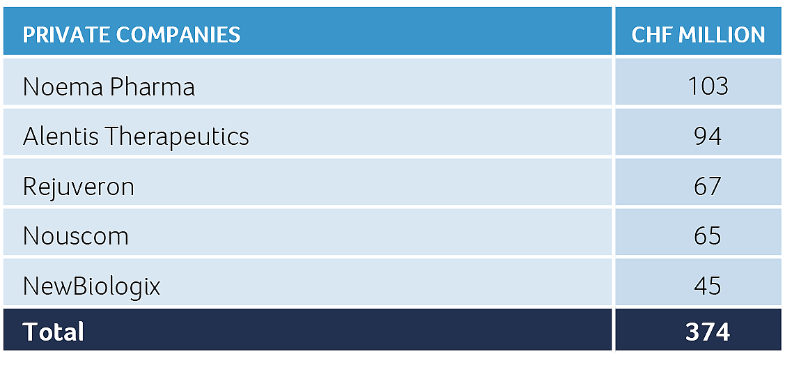 Despite the above-mentioned challenges, the Swiss biotech industry was able to raise more than CHF 2 billion in 2023 (2022: CHF 1.3 billion), an increase by more than 50% in capital investments compared to 2022, with around CHF 1.4 billion collected by public companies and the remaining CHF 0.6 transactionsbillion collected by private companies. Noema Pharma with CHF 103 million raised, and Alentis Therapeutics with CHF 94 million raised, were the two largest private company financing transactions in 2023.