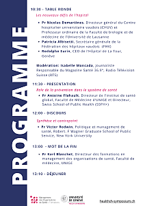 The event will alternate between roundtables on the major challenges facing the Swiss healthcare system (digital health, financing integrated care, eco-responsibility, new technologies, etc.), Masterclasses on cutting-edge operational management topics and analyses by local and international experts. There will be plenty of time for networking between dialogues and at the end of both days.