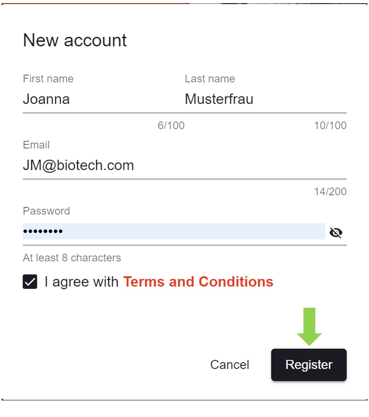 Fill out the form with first name, last name and a password of minimum 6 characters. After having consented to the terms and conditions you can click register