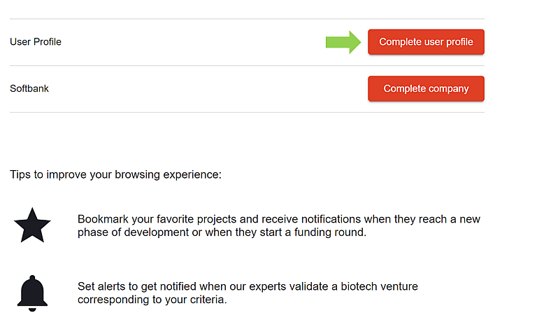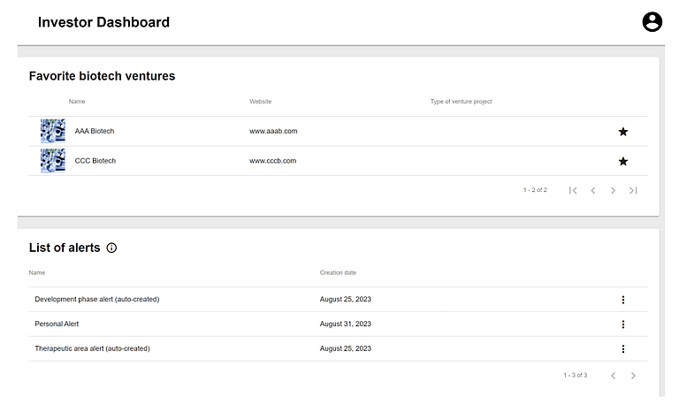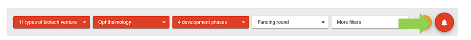 Searching for biotechs and creating new alerts is possible by clicking on the red “Search for biotech ventures” button.