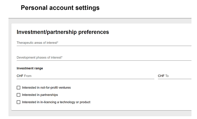 As an investor or pharma representative you can use the platform to share your investment focus and partnering interests for Swiss biotechs. We summarize best practices and guide you through the process of registering further down.